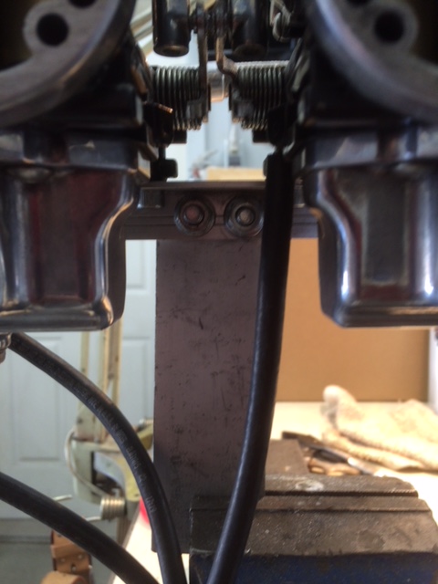YES, the carbs when mounted are at (about) a 5 degree tilt DOWN towards the engine. NOT an issue ! A "Leveling Cradle" is a good idea. Any manner of holding the carb(s) steady and level on the bench is a necessity ! I have two methods for doing this depending on whether I'm adjusting the float levels with the carbs as a complete set or individually. This is how I hold a "set". The Carb-mount needs matching two holes.