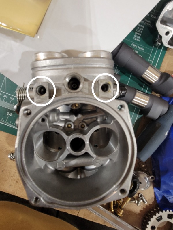 There are plugs there. The only way to get the brass pilot mixture screws in is from the top. All carburetors after 1972? had to have the idle mixture screws or in our case, the pilot mixture screws mechanically blocked so that non licensed individuals couldn't alter the factory setting of the mixture because of emissions standards.