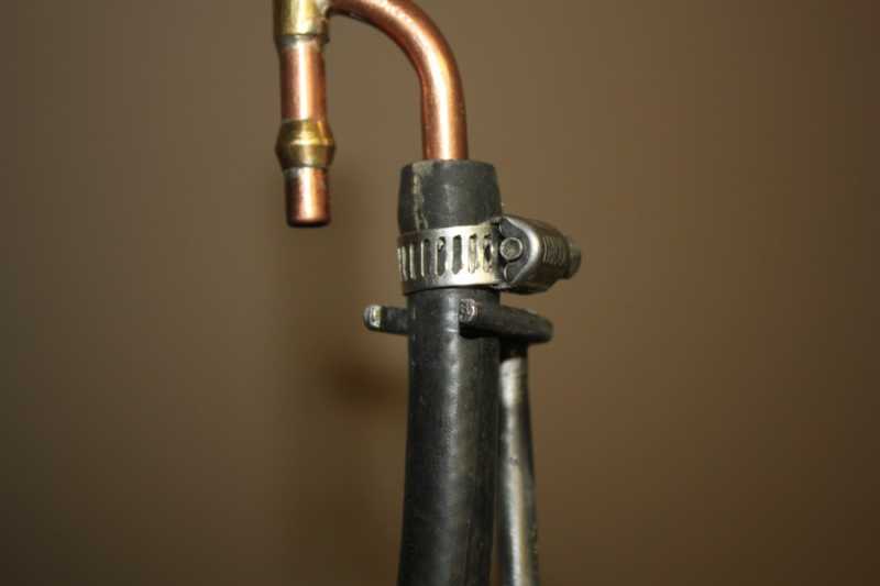 I'm lucky in that Iv'e got long fingers so getting both my index fingers in under the tank to wriggle the line off hasn't been that bad but; get a drop of fuel on the line and it gets too slippery to pinch and push. I came up with this: Another home-made tool that works perfectly for this task. By placing the fork on one side of the clamp or the other (In my fuel-line routing case the clamp at the inlet side of the fuel-filter), I'm able to push the line off or pull the line on. Pulling the fuel-line back onto the barb only requires that I align the end of the line with the barbed end of the pet.-cock. Once aligned I can easily pull the fuel-line back on.