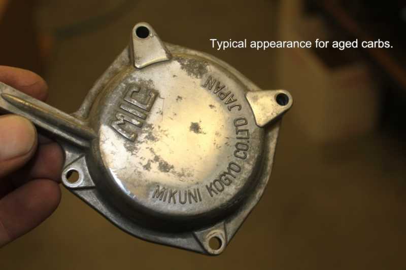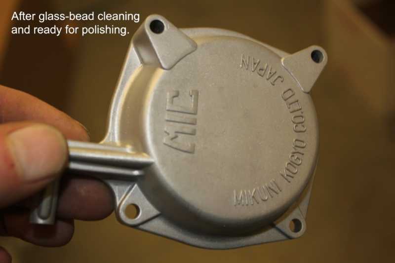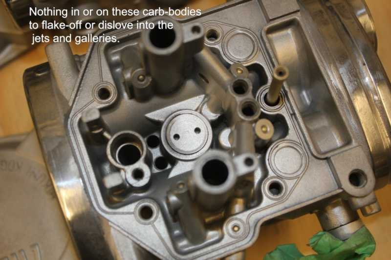 The carbs have been thoroughly cleaned now. Starting with a preliminary boiling (5 to 1 lemon-juice)for a full day which removed most of the grease, oil and some light varnish and scaling. The body, bowl and top-cover were then glass-bead cleaned (I have a blasting cabinet); with one exception. I DID NOT glass-bead the throttle-bores!