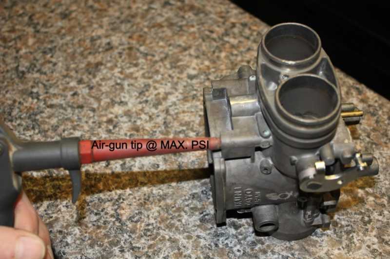 This might work for you if the slotted end of your idle-jet isn't too badly buggered. Per the picture, place an air-gun nozzle into the matching Idle-air screw hole (without the idle-air screw of course) and with Max. P.S.I. see if the jet can be blasted out. I tried it and it worked but I used an idle-jet that could be removed already, as there is no burring on it. Don't want to state the obvious but position the carb body with the jet facing down over your work bench and place a towel on the bench. If the jet is blasted out the towel will help in preventing the jet from ricocheting off the hard surface of your work-station and disappearing into oblivion at the speed of light :huh:
