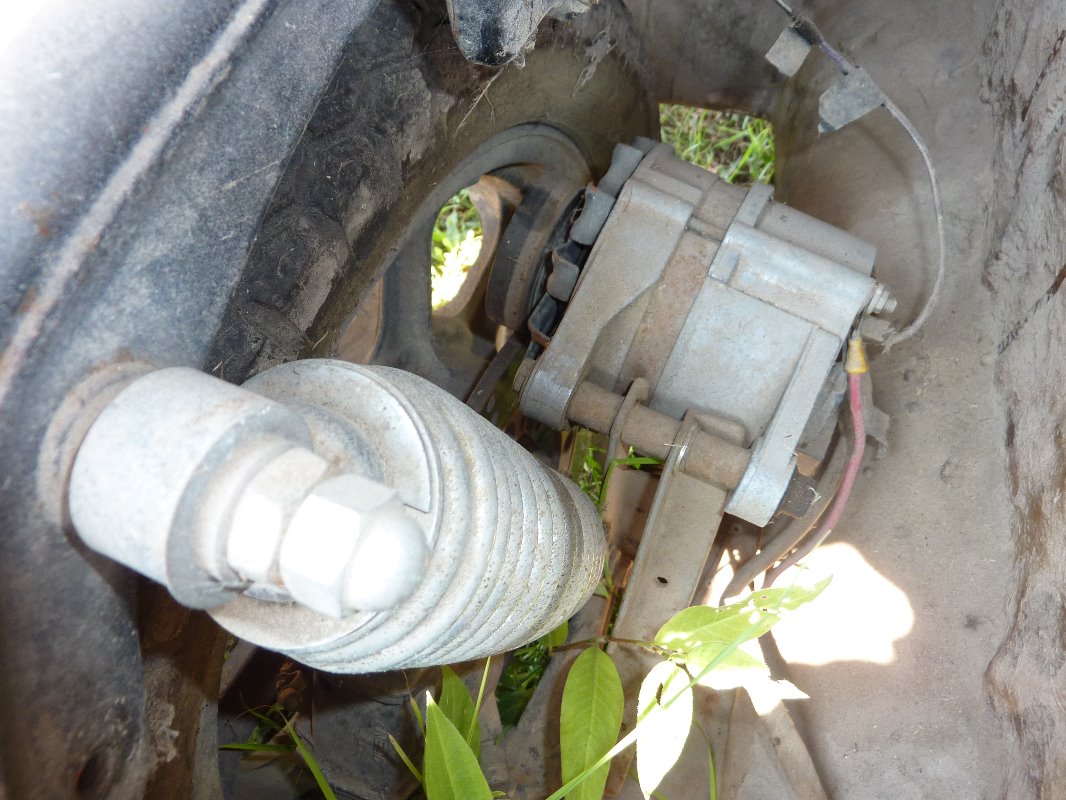 To get more 12 volt power, a automotive alternator was added to the back wheel. A bracket was made up coming of the lower shock mount. The alternator pully has a rubber outside edge and it ran on the top edge of the brake disc.