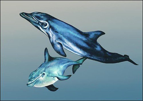 For the ocean - dolphins. These are actually a part of a large mural I painted back in '96 - size about 2 x 3 meters. The whole piece was about 22 x 22 meters (75 x 75 feet) with manta rays, corals etc. Not exactly my style, as I don't like realism much when doing art, but it's something I've done and right on the subject. I did it for the money