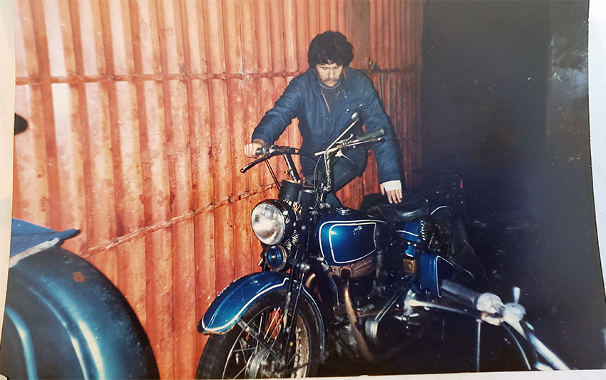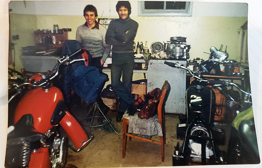 Here our Naval Academy's dormitory basement garage, and a few bikes in the adjacent container. From the left, AJS and me, next our technical bike support guy and club member Wiesiek (he had lots of experience, knowledge and contacts for any job and parts, also a great painter), BMW, and NSU which you can barely see. Royal Enfield on the bench (it was a single 500 cc.)