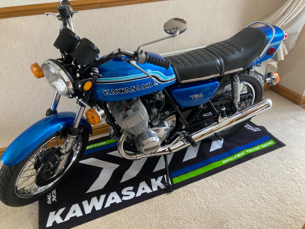 Beautiful. absolutely beautiful. Looks like it just came out of the crate and got waxed. Brings back so many memories. My last H2 was a 74 in dark green metallic. Sold it to fund the KZ1300 project. Also had a KH500 at the same time that went too . Nothing like laying down a streak of grey smoke to leave a mark. I still have 10 bottles of Klotz in the cabinet and run my weed whacker and leaf blower on it just to remind me of "Let the good times roll"