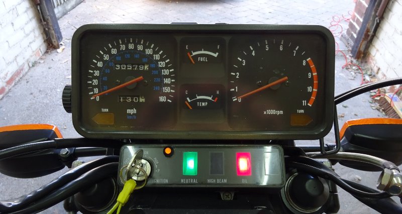 I originally fitted a voltmeter to monitor how the charging circuit was operating - however, this was giving me too much information and I was reading too much into small (0.1 volt) changes in voltage. I subsequently fitted a SparkBright Eclipse LED indicator to the instrument cluster. I fitted this next to the ignition switch rather than the spare (EU Model) headlight warning light position as there was not enough room for the small circuit board behind the LED and I also wanted to avoid any flashing lights next to the oil pressure light. The LED has a number of modes - below 12.45 volts flashing red but above 12.45 and less than 13.2 volts, steady amber - this is what you should see without the engine running.