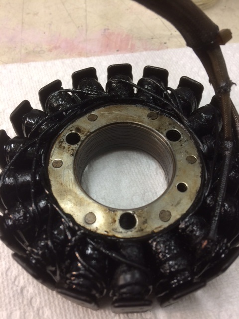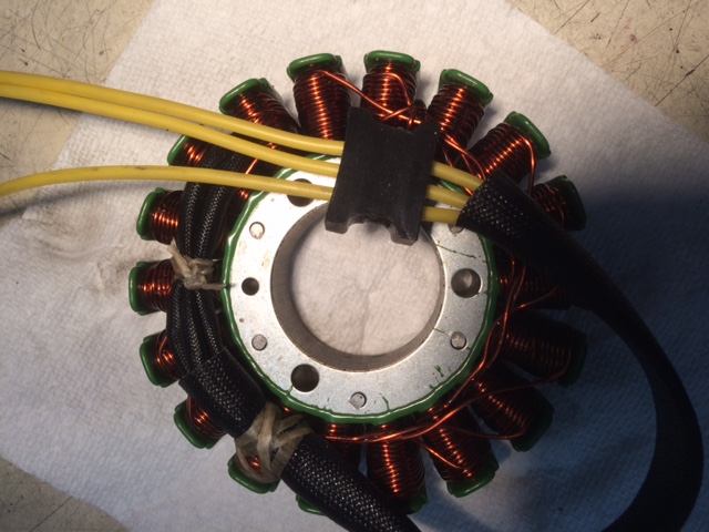The photo is of the stator I replaced. Looks fried despite having good continuity between the Yellow leads and there was no short/ground to frame. However, One phase was delivering about 30 % less A.C. then the other two phases so decided it prudent to replace the stator while installing the new MOSFET V/R.