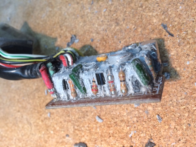 I warmed the case and the end-cap released and the potted-circuit-board pulled out cleanly ! Soaked the entire block (epoxy) over night in some lacquer thinner. Next day I started picking. Once the soldered side of the board was cleaned I fluxed the terminals and re-soldered each one. Also soldered the 6 harness block and 2 bullet plug terminal ends. Plugged the unit back into the bike and using my cordless drill (chuck) I spun the front wheel. 24 rotations and the unit turned the signal off. Repeated several times. Unit now works. The circuit-board slides into to the case in a track. Used some hot-glue to secure the board in this track and a bead on the inside perimeter to seal the snap-in case-end.