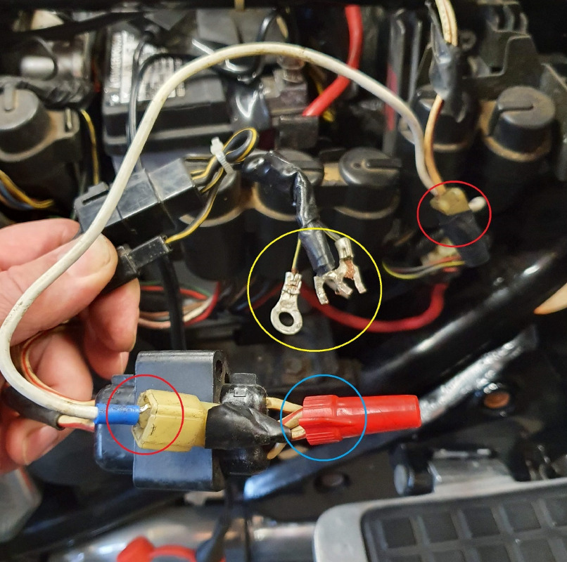I realise that the 2 red circles should connect together but this has been cut with the white wire being fed directly from the Live side of starter relay (I think that's what is is anyway).