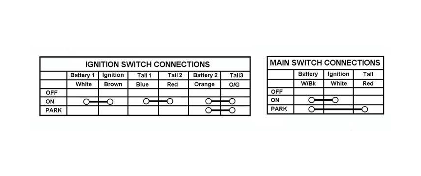 On the bottom of the electrical diagram for each of the KZ1300 wiring diagrams are the notations for the switch positions. I've copied the switch positions for the ignition switch and the main switch here for discussion.