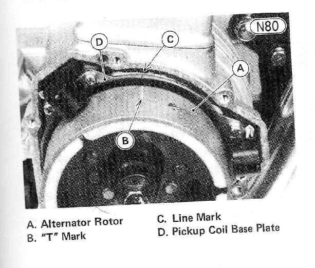 I have a manual for the 82 model and it refers to two additional marks the "1" mark and the "2" mark. There's a straight forward description of the process to work one's way through measuring the various valve clearances. Does your rotor have the 1 & 2 marks?