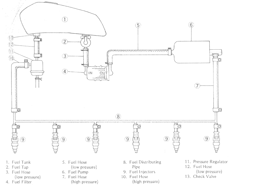 So if the pressure gauge is on hose #10. it should read 2.27 - 2.47 bar depending. On hose #12 basically nothing. If the injectors are pressurized at 8 bars the likelyhood of them closing after the signal pulse from the DFI would be nil. The spring in the injector is at a spring loading to close the injector under normal pressures. If it was too strong a pressure, the signal pulse that opens the injector by pulling the plunger via an electromagnet would not be strong enough to open the injector.