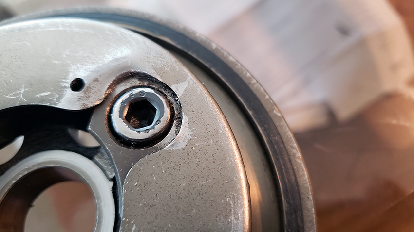 Here a clutch with damage cause by using wrong bolts. 0nly one correct, the other two much too short. 0ne was just a bit tight, the other one loose - definitely the torque was not correct, plus there was no thread locking compound! As a result, there was undesired movement of the starter clutch and one of the push pins and the spring got damaged. As seen in this photo, the cover plate was also affected. The loose roller pushed the cover plate out and it was rubbing against the gear.
