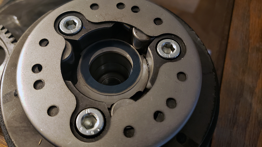 Luckily, I was able to straighten the cover plate, and there is no other damage. The slightly different shape of the plate around the bolt is irrelevant, as it has no function other than stay in place and hold the rollers inside. The gear inner hub is still nice and round. With new springs and push pins the clutch will work just fine.