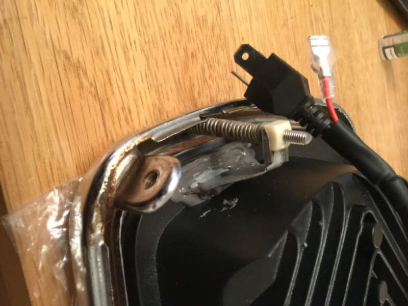 What I wasn’t sure of is how this light would fit into the existing headlight chassis so took a chance thinking how hard can it be. The main problem is there is no brackets on the new light to secure it to the chassis. There isn’t a bracket for the headlight adjuster either. The main brackets are from some brackets used to suspend house light from the ceiling.