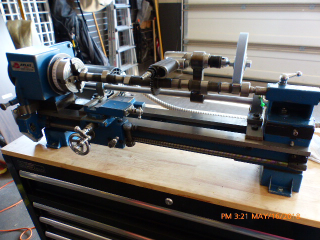 It's just a little 7"x24" atlas lathe. I have it mounted on a tool box. Here's a pic of it with a camshaft chucked up and one of my many attempts at tooling up to grind camshaft profiles. It's a cute little $400 experiment. It has a carriage feed that's adjustable by changing out various gears. When I got it, I just wanted one big enough to play on and not take up too much space in the shop. Just something to doink around on.