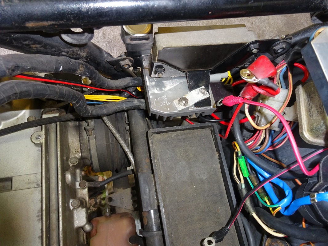 Not sure if this helps but I took some pictures that show the earth cable when I fitted a Shindengen regulator. The airbox and carbs have been removed which shows the earth cable attached to the back of the block, passing under the battery tray and feed up next to the battery on the left of the bike behind the battery.