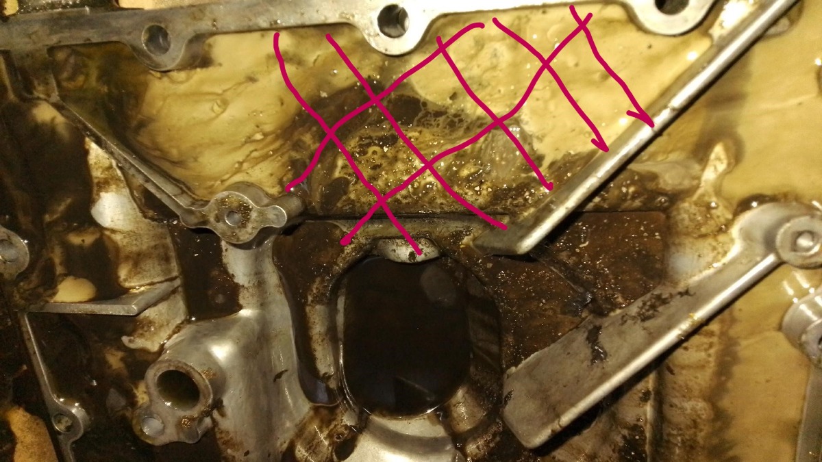 The only possible accommodation in the oil pan with direct drop from the top of the block is marked in red.
