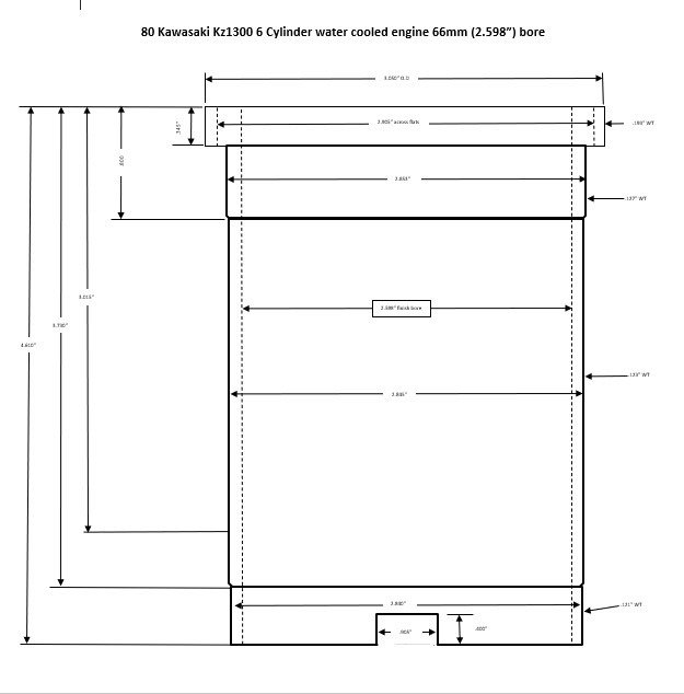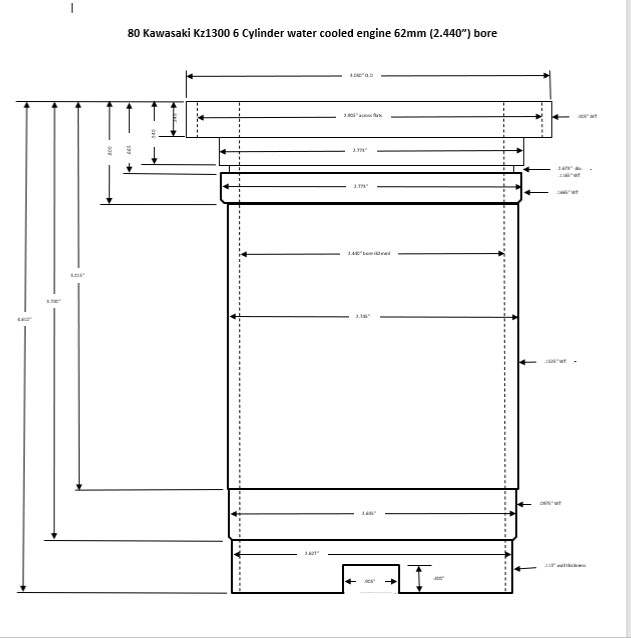 This is a drawing of a proposed sleeve for a 66mm big bore. It would require boring out the cylinder block top and bottom. No o ring groove on the top which means the head gasket is now the sealing point between the water jacket, the cylinder block and the cylinder head. This is a similar practice to what happens when Darton Wet Sleeves are installed. I still need to add o ring grooves (2) to the bottom of the sleeve for sealing the sleeve to the cylinder block. Just need to check and see if I can do this with .070" Nitrile o rings.