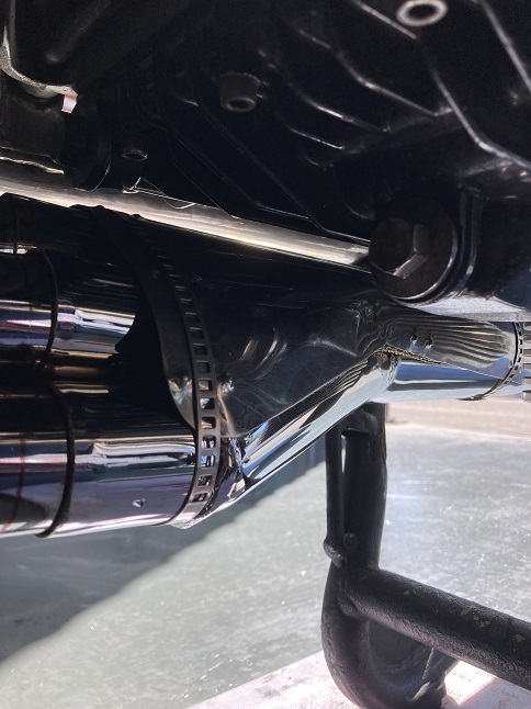 A few years(?) back while reinstalling the oil pan ( oil screen service) I had reason to think about the significant heat transfer from the massive header collector, to the oil pan. I decided to wrap the collector. 34' of header-wrap (one piece) provided a double layer of insulation. It was so effective that I could touch the wrap without burning my hand. While recently dealing with the D.G. bullshit I was considering doing the same with the new collector but thought it would be criminal to hide all that new shiny chrome. My solution for the new exhaust was a S/S shield. It has 2 layers of header-wrap with a layer of aluminum foil and is retained by 2 C/V boot clamps.