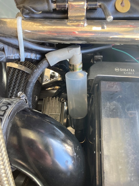Riding the past two years in 38 C. / 100 F. air temps. the oil never went above 75c. / 167F. I had some initial concerns about moisture in the engine and the low oil temp. not being able to evaporate it. That was quickly dispelled and no longer of any concern. To confirm crankcase condensation is being dealt I installed a temporary accumulator between the crankcase vent and my air filter.