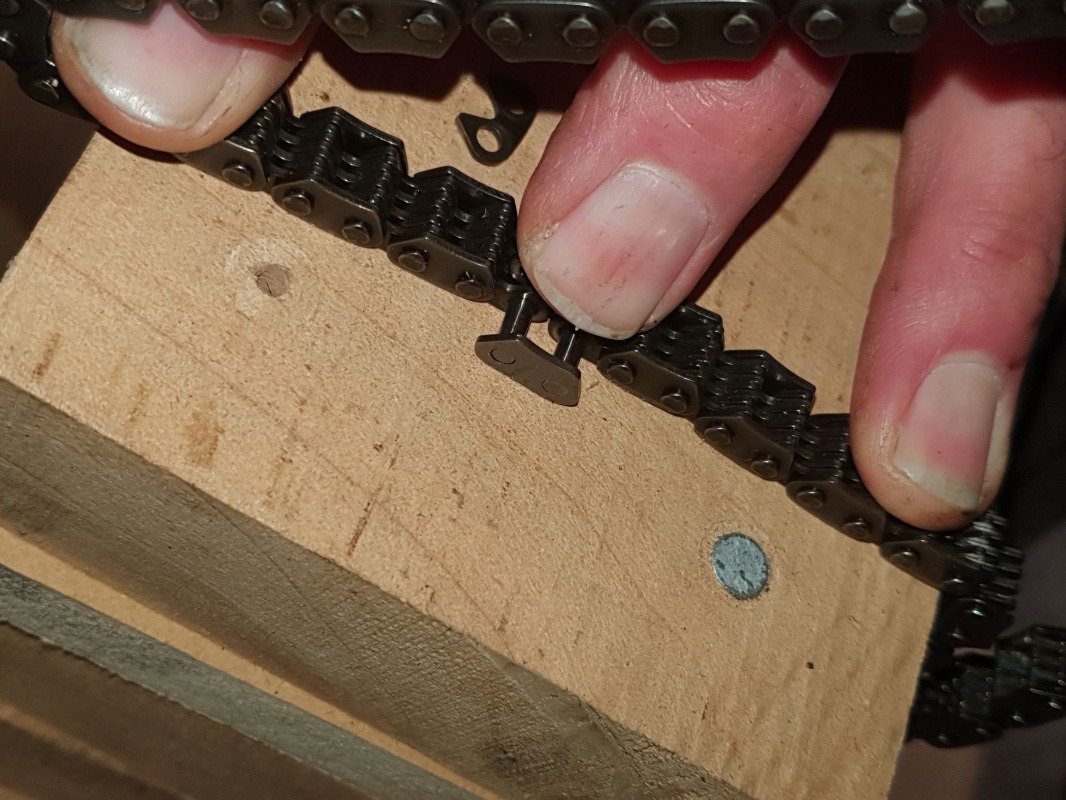 I didn't trust myself to break the old cam chain and install joining link in new one, over the engine - even with the sump off there was just too many places for those tiny link plates to hide if they slipped past the rags, or fell through when removing the rags. So I did everything in front of the engine. After threading the new cam chain through (on end of the old chain, after breaking both) I had both ends hanging down over the front of the engine. Then made up a simple platform with wooden blocks, a few centimeters below the top of the engine cases, so I could work on the ends with one hand while manipulating plates and pins with the other. Hopefully the photos will help explain (recreated using old chain and stuffed joining link). Hold both ends together with fingers of one hand, insert joining link through first couple of plates, then insert first of the three intermediate plates so that it is aligned but resting on the joining link pins. Hold that plate in place with a third finger, pressing down slightly, then gently ease back the joining link until the inserted plate pops down and giggle the joining pin through this to next couple of plates, repeat for second and third plates. As the final outer plate of the joining link is a press fit, it wont easily sit in place so I used a dab of assembly grease to hold it there. The platform was also handy for resting the riveting tool on so you didn't need a third hand. And I used small fine grinding wheel on the Dremel to take the heads off pins before pressing them out to break the chains - made it a lot easier. Hope all this helps the next person. Oh, and if you think your old cam chain is just on the service limit (length measured between 20 links) like mine was, it will be ok, check out how worn the pin is from my old cam chain!