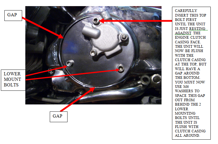 PLEASE ENSURE THAT YOU FIT THE M6 BUTTON HEAD ALLEN BOLT PROVIDED IN THE KIT THROUGH THE PLATE FROM BEHIND AS SHOWN IN THE PICTURE BELOW. IT MUST BE FITTED THIS WAY TO AVOID CONTACT WITH THE CLUTCH CASING.