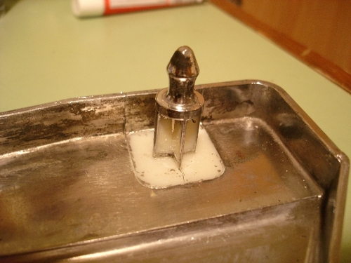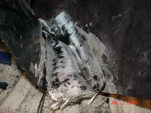 Of course model cement alone would never be strong enough so I used fiberglass fabric to reinforce the base connection. Here's a picture of the fabric laid into a wet layer of model cement. There are actually two layers of fiberglass fabric. The model cement anchors the fiberglass soundly to the base plastic.