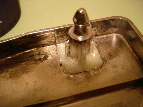 Chromed plastic, styrenes as far as I need to know. I've repaired styrene plastic with a similar technique. Here is a styrene side cover from my 1300 Voyager that had the lower post broken off. In this first picture I've scraped off the chrome covering to expose the cream colored plastic, which I believe is styrene. I cleaned the whole area with denatured alcohol and then used plastic model cement to glue the post back in place.