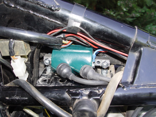 Those coils are Dyna brand 3.0 ohms (no ballast resistor needed). I've mounted one where the top coil usually goes. The remaining two are in the tool tray. I wondered whether or not the different length wires would be a problem. Several folks, mechanical sorts, told me that I'd have problems with my computer (none on the bike)or possibly my radio (I'm ridin, what do I need music for?).