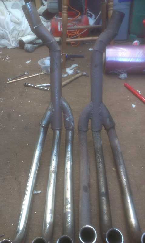 Hope I'm not posting too much at the moment but the plans are all coming together..This one is is looking for thumbs up or forget it! Got my stainless 6 into 2 to go on and have the bike looking pretty standard. The plan is to have a "loud" paintjob done on the spare colourset I've pieced together and I would like a 6 into 1 with the loudest scream possible as I am a big kid and like to show off.The exhaust that came on the bike is virtually unsellable as its been cut to bits and badly welded back together with bits of drainpipe and is covered in rust. It is however solid and strangely looked fine on the bike unless you looked closely. Does it seem feasable to get the two ends joined to 1 with a bit more drainpipe and try some different endpipes on until I get the sound I am looking for, and hopefully not looking like a complete arse...Just ignore me if you want...the Mrs always does when I start waffling!