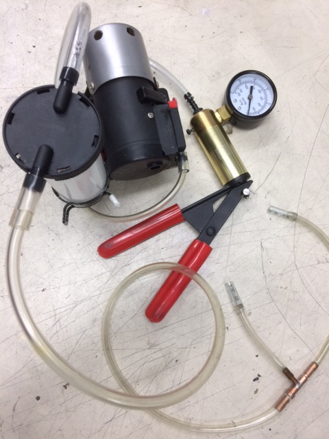Basically it's the vacuum-pump from a Kitchen Vacuum Sealer with some odds and ends. Runs off a 12volt 1000ma power supply. About 2"hg vacuum and it evacuates both calipers simultaneously and almost too quickly.. I had to watch the reservoir level closely. The hand vac-pump was connected merely for the gauge.