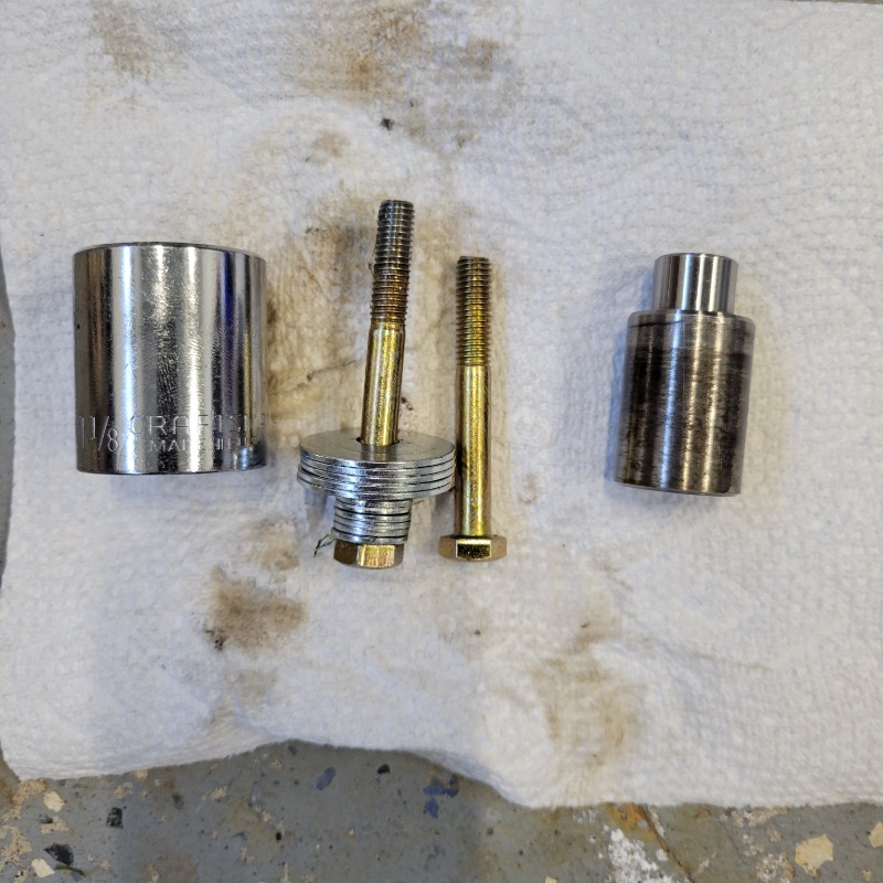 When I had turned in the bolt 5 threads I knew I had run out of depth in the pin, so I switched out the bolt for the 60mm bolt and again tightened down until I ran out of thread , then switched out to the 50 mm bolt and finished removing the pin