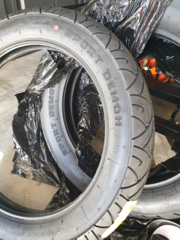 When new, the bike came with 110/90V-18 . front. 130/90V-17 rear.. And with a tread pattern that maybe not available any longer.