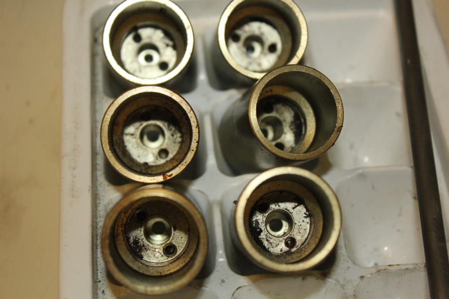 First; The float-bowl for the left carb. had a significant amount of rust collected on the left side of the bowl. The center and right carb. bowls did not have this build-up. It would seem apparent that the tank on the former bike had significant rust issues (and no fuel filter) and given that the fuel "tee" is between the Left and Center carbs the build-up in the left bowl is logical. The debris would flow from the tank to the "tee" and given the bike spent time running on the side-stand, the heavy rust sediment would naturally flow down-hill from the "tee" to the left carb. and accumulate in the lower side of that bowl (when on the side-stand). Additionally I discovered a solid "plug" of similar rust debris completely blocking the fuel port immediately above the Float-needle valve-body of the Center carb. This blockage would have rendered this carb. completely incapable of receiving adequate, if any fuel. Having said this, it is possible that enough fuel could seep through the blockage giving enough fuel for idle but certainly not for anything above idle. Unfortunately I had removed this blockage prior to seeing this thread but the explanation should be self explanatory. The photo of the slides shows significant dirt on the inside which is testimony to the fact that the bike had been running with no air-filter or a damaged one. Operating any engine without a good quality air and fuel filter is inexcusable, defies logic and shows either the lack of comprehension for their requirement and/or speaks of someone's desperation in trying to solve an issue in a misguided manner.