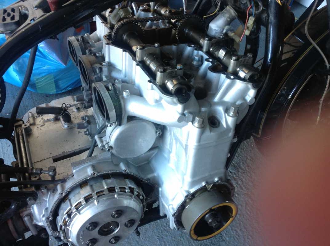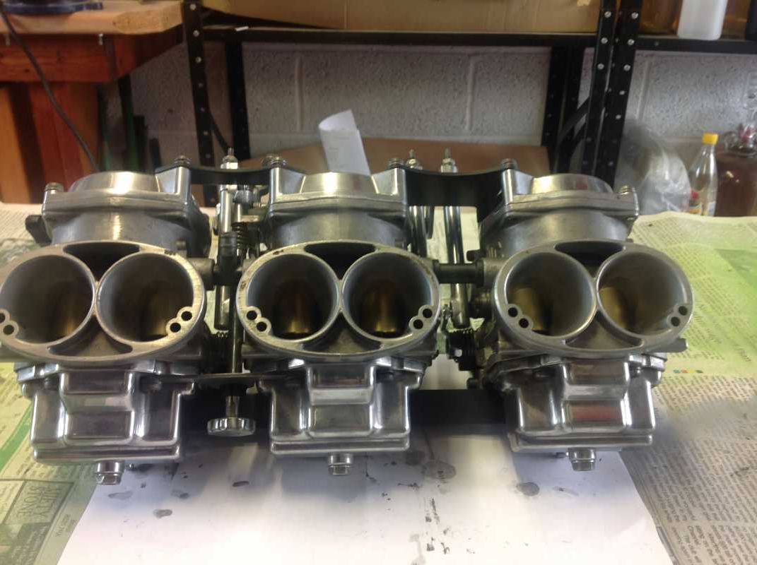 9 years 8 months ago - 9 years 8 months agoSome initial pics, will start taking a few more. So far I have claened every electrical connection ( still have a green tinge in some of them so probably will change the whole connector).The swing arm and a few untidy areas of frame around the shock mounts have been rubbed down and repainted. The area under the carbs and the front crankcase have been repainted with Frost Restoration high temp silver paint and everything is being polished as I remove it. I bought myself a polishing wheel and various compounds to do the job, however, it is very time consuming and a filthy job. I used a dremel based polishing kit to get into small areas. One job I am finding hard is the rear final drive case; I am not weedy but I do find it heavy and therefore to hold it at the polishing wheel for any length of time is not easy. On top of that the casting of the case is rough and does not polish easily. The valves have been done- I found three valves worryingly tight with virtually no clearance but luckily no damage seems to have been done. The carbs unfortunately failed a leak test on the float valves so they will have to be changed as there are no overflows on these carbs. Also the tee piece which feeds petrol into the carbs is now weeping so I will probably have to make one that will take replaceable O-rings.