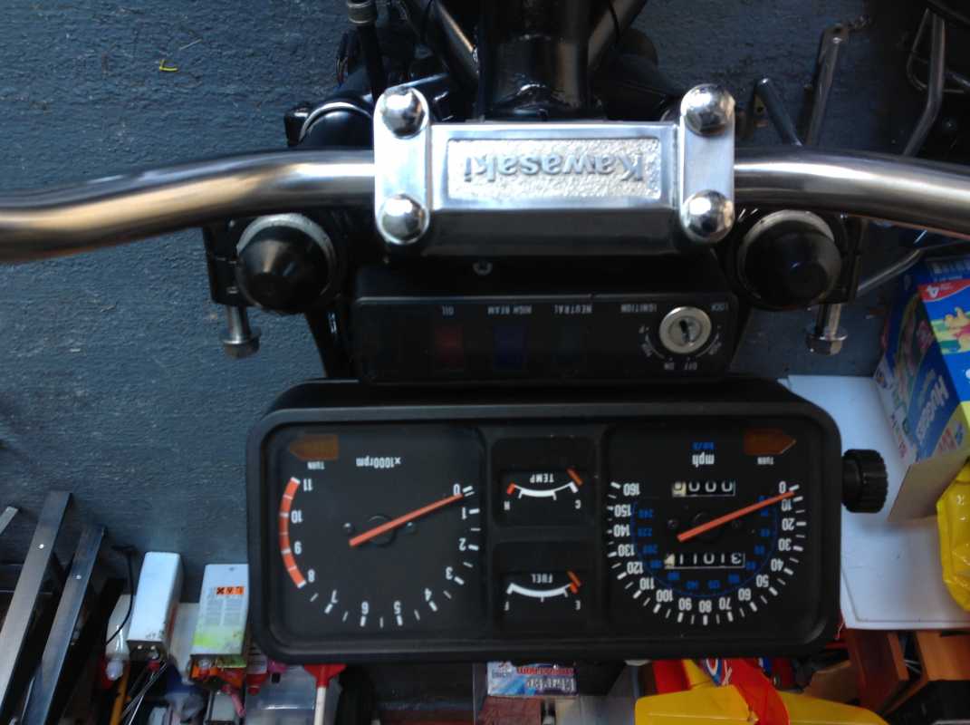 9 years 5 months agoBinnacle and warning panel back on. Bars have been polished. All connectors and wires cleaned and looking ok. The top and bottom yokes have been painted as have the headlight hangers. The head bearings seem ok so I have left them alone for now. The fork seals also seem to be ok so I will give them the benefit of the doubt- for now.