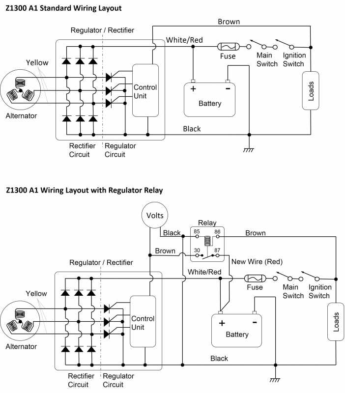 Just to complete this thread, I have attached a wiring diagram below that shows the original charge system layout and the modified arrangement with relay in case anyone else needs to do this. It also shows where I connected the voltmeter as I wanted to monitor battery voltage, not the main feed wire voltage (brown wire).