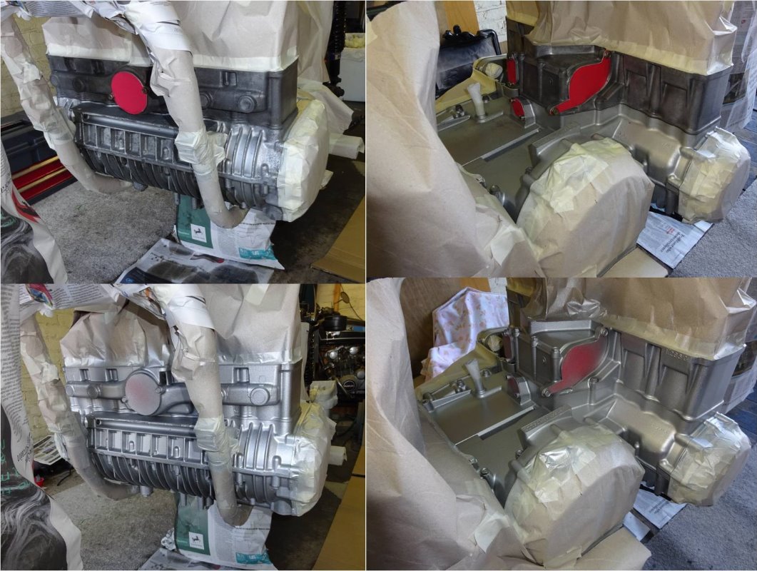 However, it was the renovation and paint work that took the most time. I have seen a number of comments on this forum about the pros and cons of re-spraying the engine either installed or removed. Removing the engine is no small undertaking and there is always the risk of damaging the paintwork during re-installation. I decided to re-spray the cylinder head after it had been removed – allowing easier prep and better access. I also brushed and cleaned the water outlet housing, timing/ignition pickup housing and sump but left them as bare aluminum as that seemed to be the original factory finish? The block and crankcases were prepped and sprayed in the frame and required a substantial amount of masking of the frame, top of the cylinder block, side covers etc. I am not sure the re-spray was any faster by not removing the engine as access for hard to get areas to prepare for painting is much more difficult and time consuming. However, preparation is everything when it comes to painting and I spent many hours with a brass brush, Dremel flex shaft and brass wire attachments and regular vacuuming to remove debris and cleaning with thinners.