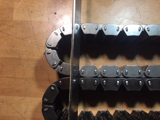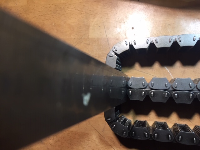 You have both old and new primary and secondary chains. Could you measure them in the same manner as the cam chain is evaluated? Theses are more rigid and shorter, but maybe it would be possible to compare the lengths. And your chains are a perfect scenario - for both you have brand new, and old just exceeding the service limit.