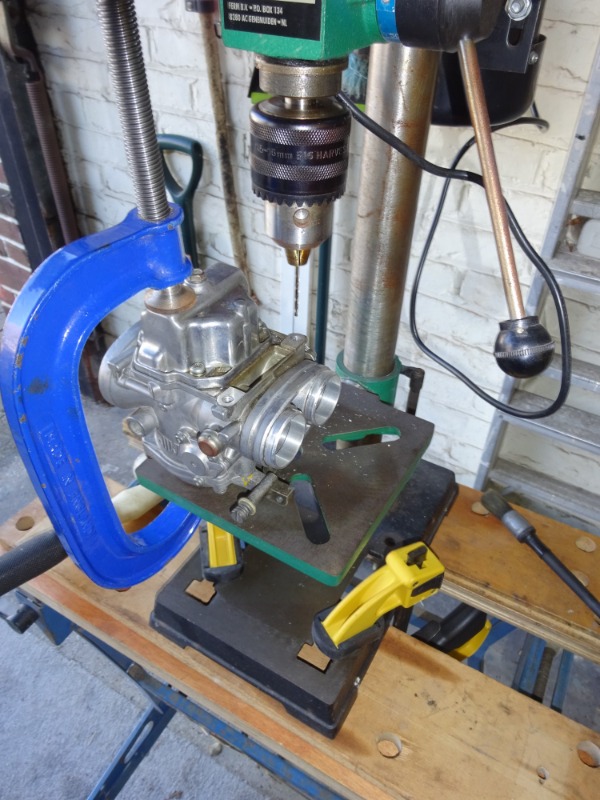 I dismantled the carbs one at a time and removed the floats, needle valves and jets and turned them over and removed the choke plunger valves, diaphragms and pistons together with the pilot air jets. I then tapped the choke air inlet hole in the upper body with an M6x1mm tap – as the choke air jet is slightly smaller than the recommended tap drill size, I found it important to make sure that the tap was aligned as carefully as possible with the hole centre - I just about perfected this by the time I got to the third carb – as usual! I also greased the tap heavily to try and keep any swarf attached to the tap rather than dropping into the choke channels. This worked to a certain extent but any remaining particles were vacuumed out using a plastic pipe connected to the end of my old vacuum cleaner. A few sprays of carb cleaner entered via the choke plunger hole helped to ensure that the channels and threads were clear of anything that might end up blocking or damaging the carbs/engine.