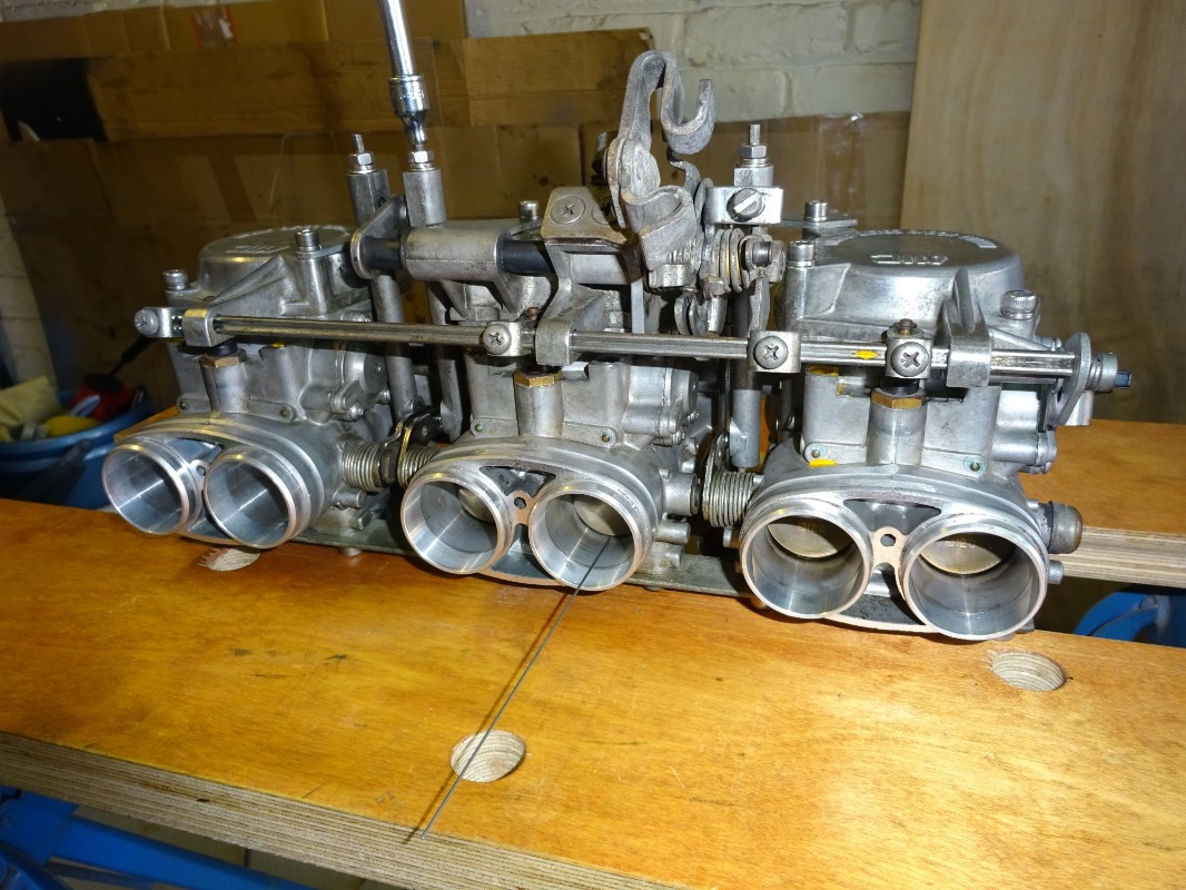 I rebuilt the carbs, checking float heights and fitting new float bowl gaskets and I also replaced the fuel feed joints with some brass aftermarket units that also feature separate “O” rings rather than the originals which seem to have integrated seals. Re-fitting the carbs to the mounting plate whilst connecting the throttle plate link rods is a bit finicky but persistence pays. Also important to ensure that all carbs sit square relative to their axes to ensure a good joint to the inlet stubs without any leaks due to misalignment. I was a little confused initially by the instructions in the workshop manual to bottom the link rod adjusting screws as I thought this would just fully compress the internal link rod springs. However, the internal rods have a recess that allows room for the spring to compress without completely flattening them. I then backed out each 1.5 turns as recommended. I found the best way to match throttle openings between each carb was to use the “wire method” – turning in the idle adjusting screw near to its maximum to open the throttle plates slightly and then using a thin wire to check the clearance between the throttle plates and carb apertures until they were matched as closely as possible – I only had to turn the adjusting screws by about +/- quarter turn to reach an acceptable match.
