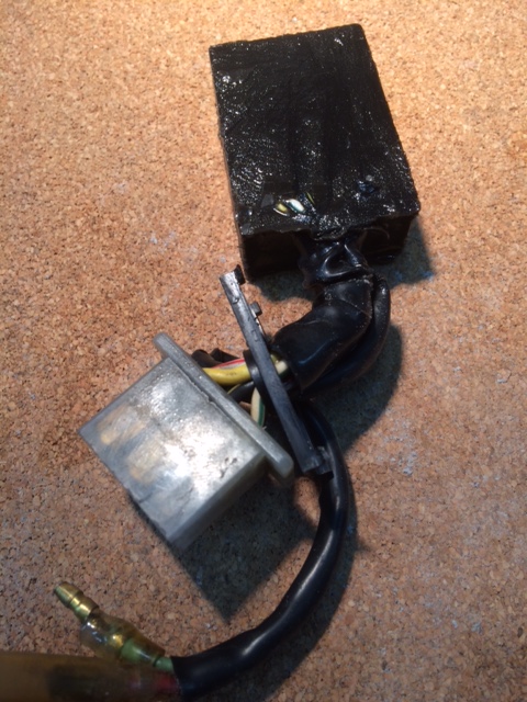 I warmed the case and the end-cap released and the potted-circuit-board pulled out cleanly ! Soaked the entire block (epoxy) over night in some lacquer thinner. Next day I started picking. Once the soldered side of the board was cleaned I fluxed the terminals and re-soldered each one. Also soldered the 6 harness block and 2 bullet plug terminal ends. Plugged the unit back into the bike and using my cordless drill (chuck) I spun the front wheel. 24 rotations and the unit turned the signal off. Repeated several times. Unit now works. The circuit-board slides into to the case in a track. Used some hot-glue to secure the board in this track and a bead on the inside perimeter to seal the snap-in case-end.